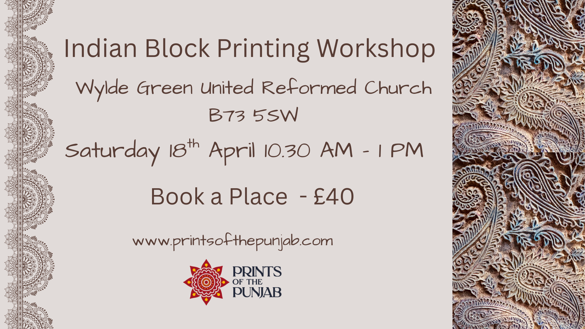 Indian Block Printing Workshop - Create Hand-Printed gifts - Saturday 18th April 2026- 10.30 AM - 1 PM in Sutton Coldfield